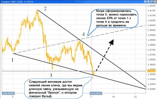 В данном примере мы детально рассмотрим процесс формирования волн Вульфа. Для анализа был взят 4-х часовой график GBP/USD.