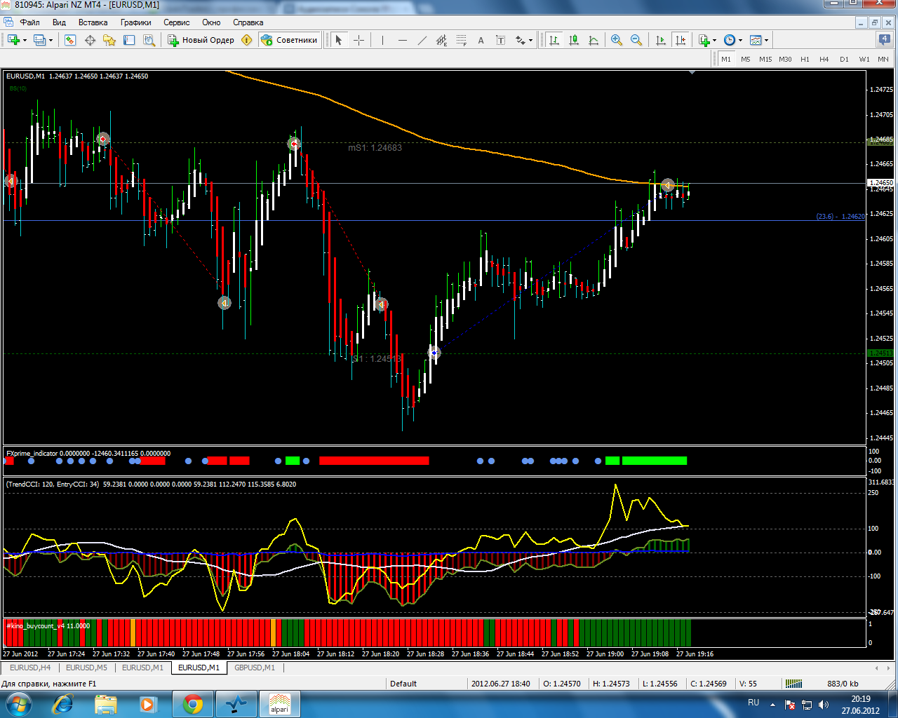 при пробое флэтовых участков так же можно заходить в сторону пробоя с минимальным стопом(я использую от 2 до 10 пп стоп)что б обезопасить себя от ложных пробоев, в трендовом участке я использую несколько индикаторов для определения тренда а именно MACD Histogram (13,21,1) — цвет КРАСНЫЙ MACD Histogram (21,34,1) — цвет ОРАНЖЕВЫЙ